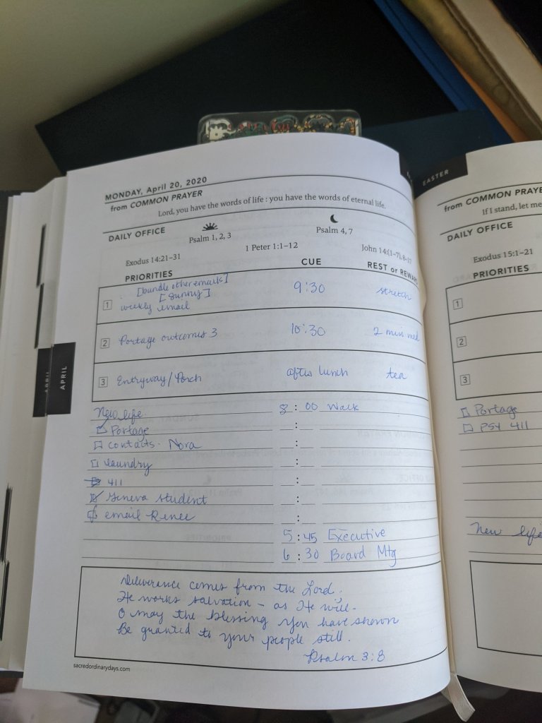 Finally, on a daily basis, I’m reminded to start with Scripture, with readings from the daily office. I love reading the same Scripture as fellow believers around the world, and I’m using the white space at the bottom of each page to copy or reflect on some of the passages that I’m reading.